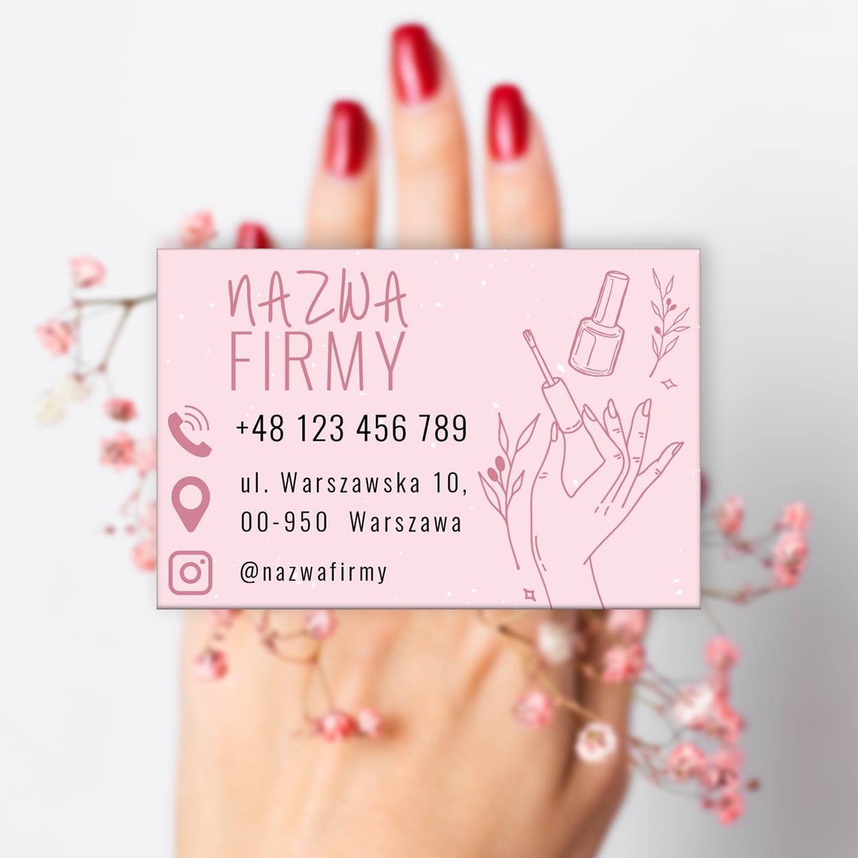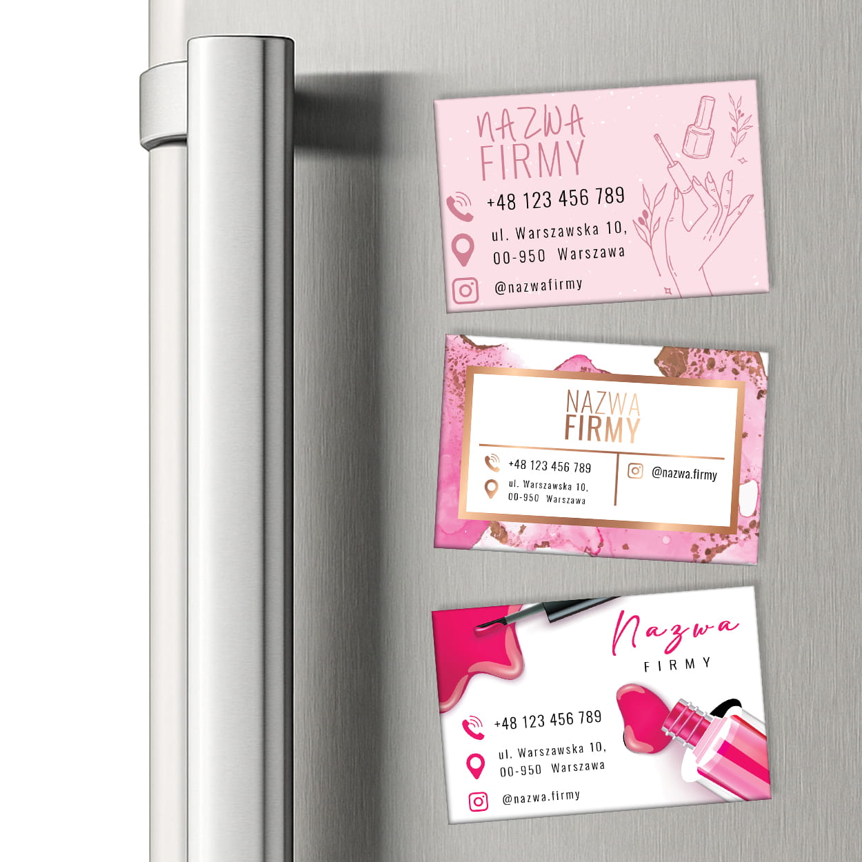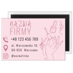 Elegancka wizytówka w formie magnesu, która przypomina klientkom o szybkim kontakcie z salonem i zachęca do regularnej pielęgnacji paznokci.