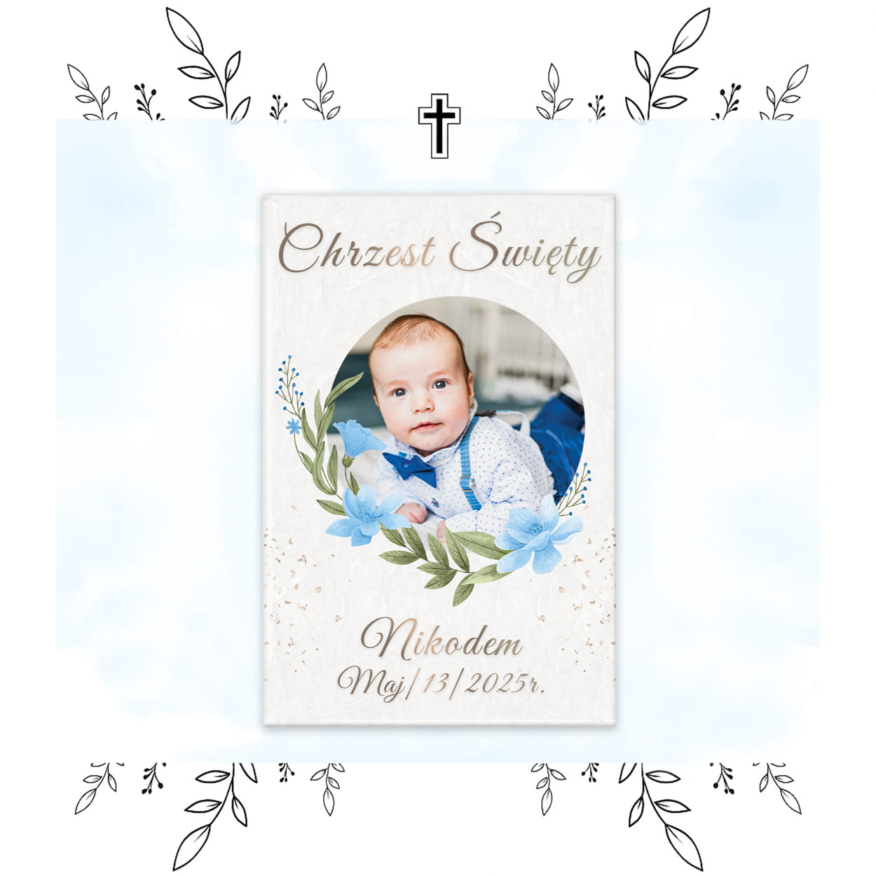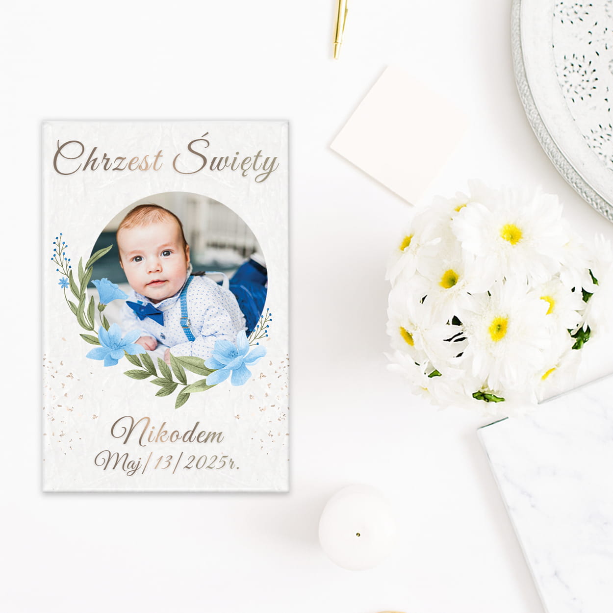 Magnes – Pamiątka Chrztu Świętego ze zdjęciem „Błękitne Kwiaty”