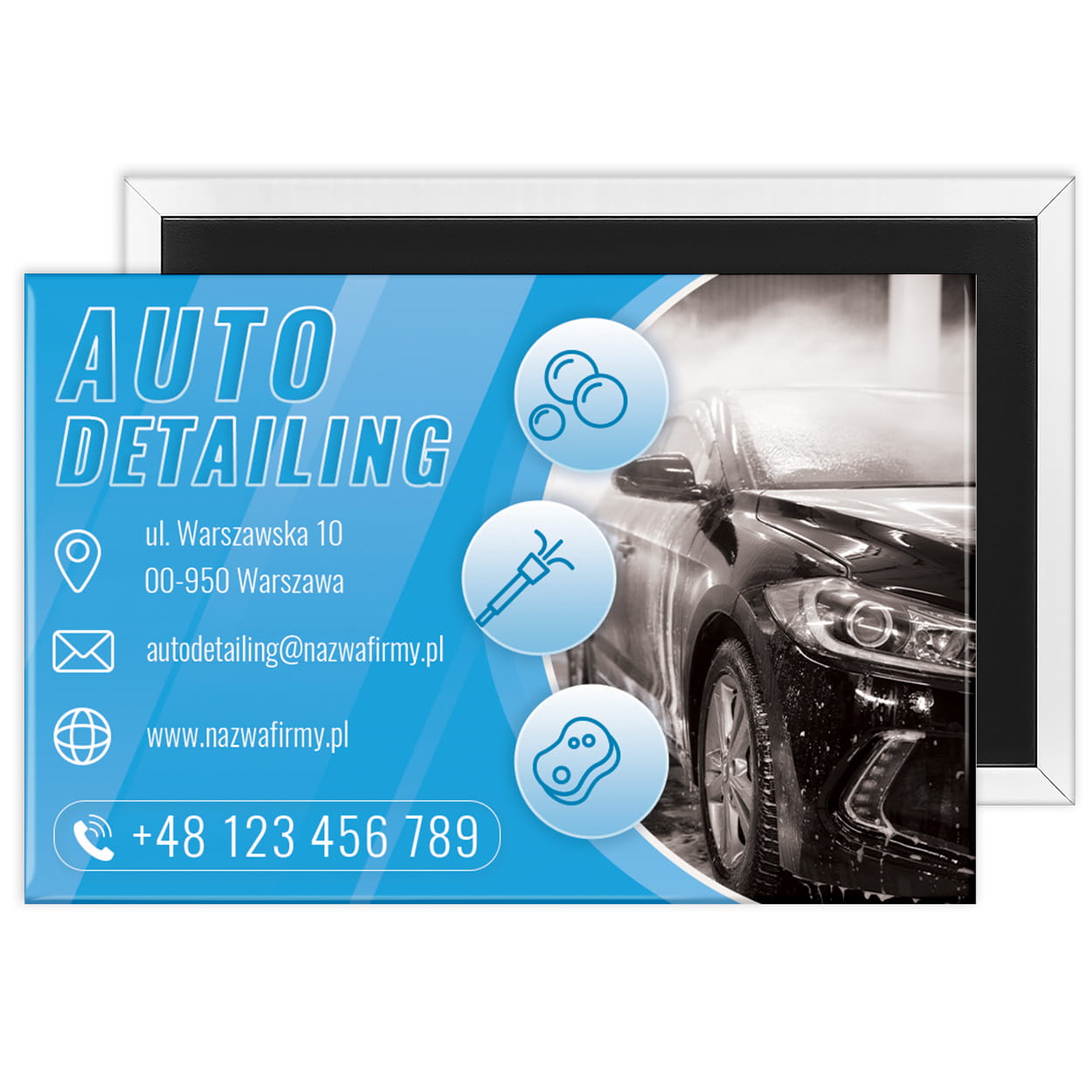 Stylowa i praktyczna wizytówka w formie magnesu, która zawsze przypomina klientom o szybkim kontakcie z Twoim studiem auto detailingu i dbałości o perfekcyjny wygląd samochodu.