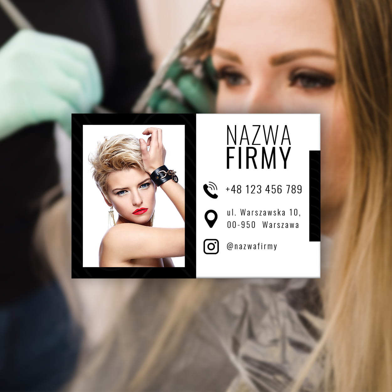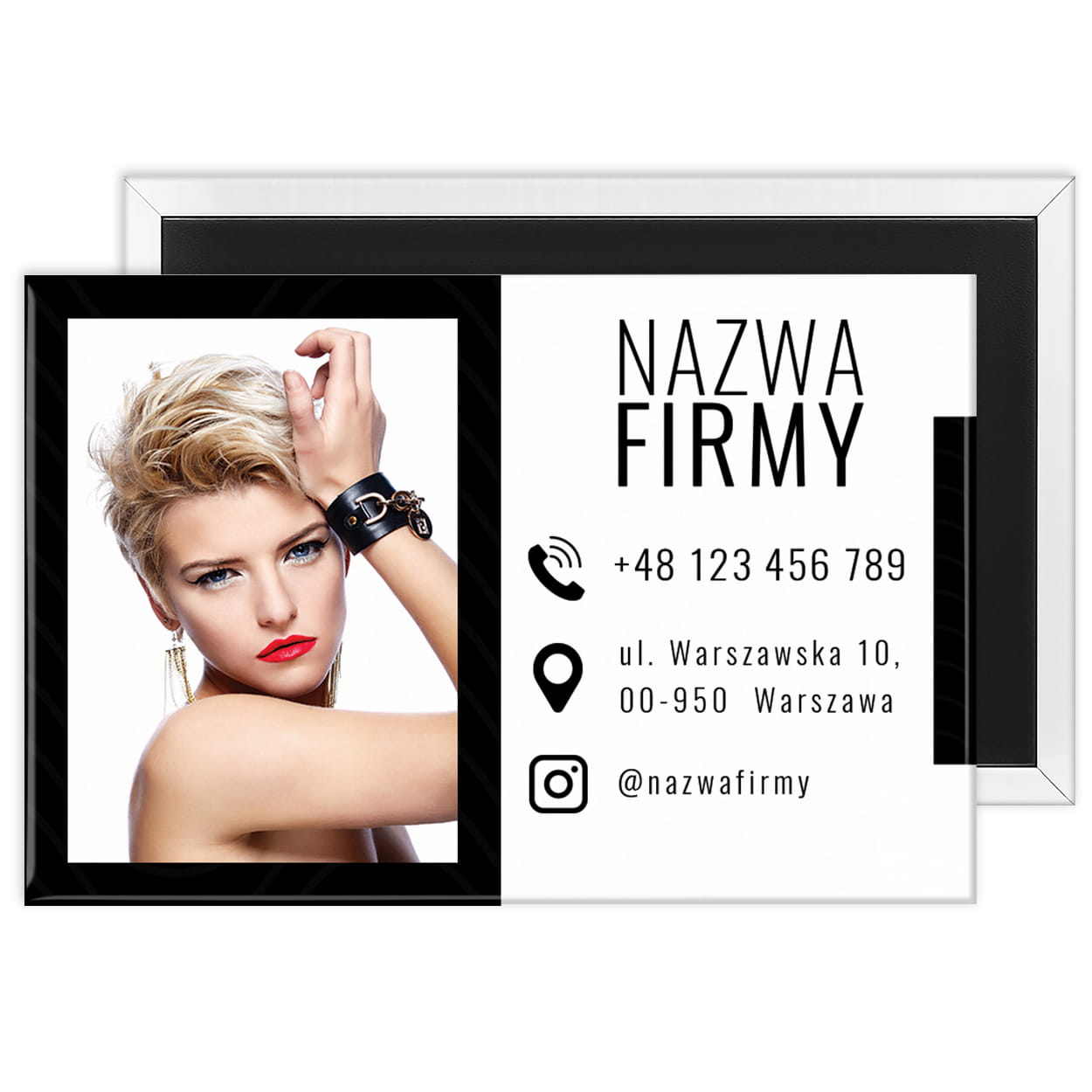 Stylowa i funkcjonalna wizytówka w formie magnesu, która zawsze przypomina klientkom o kontakcie z ulubionym salonem fryzjerskim.