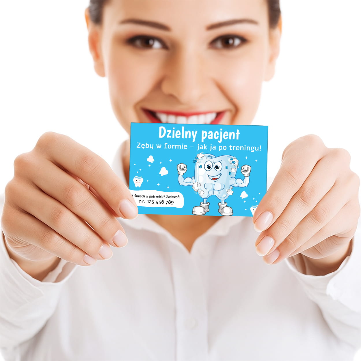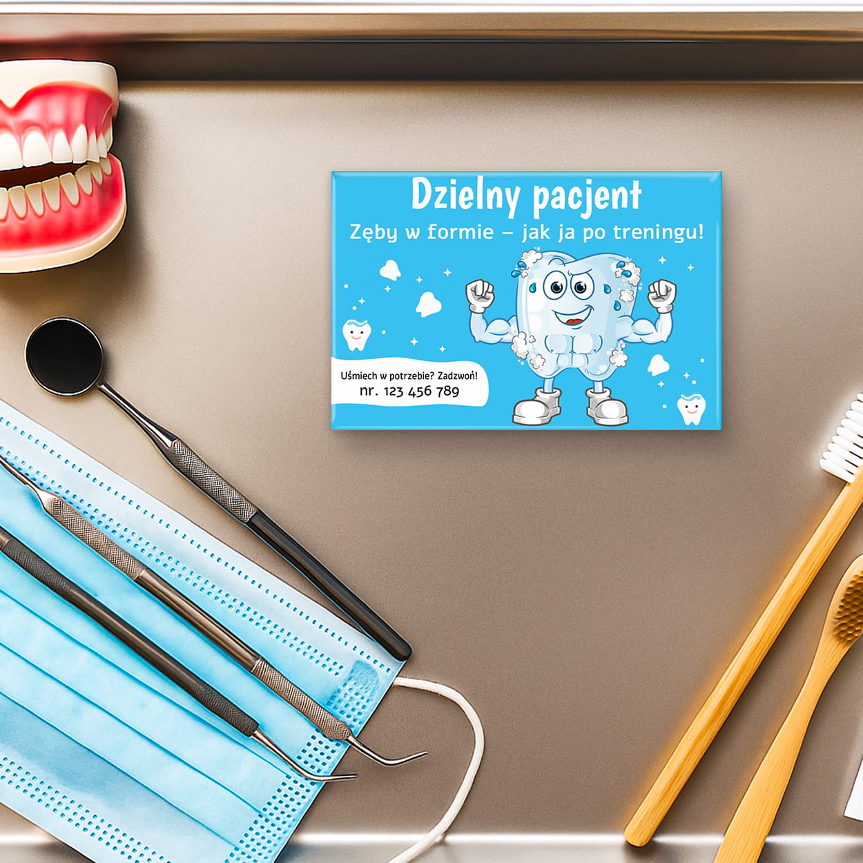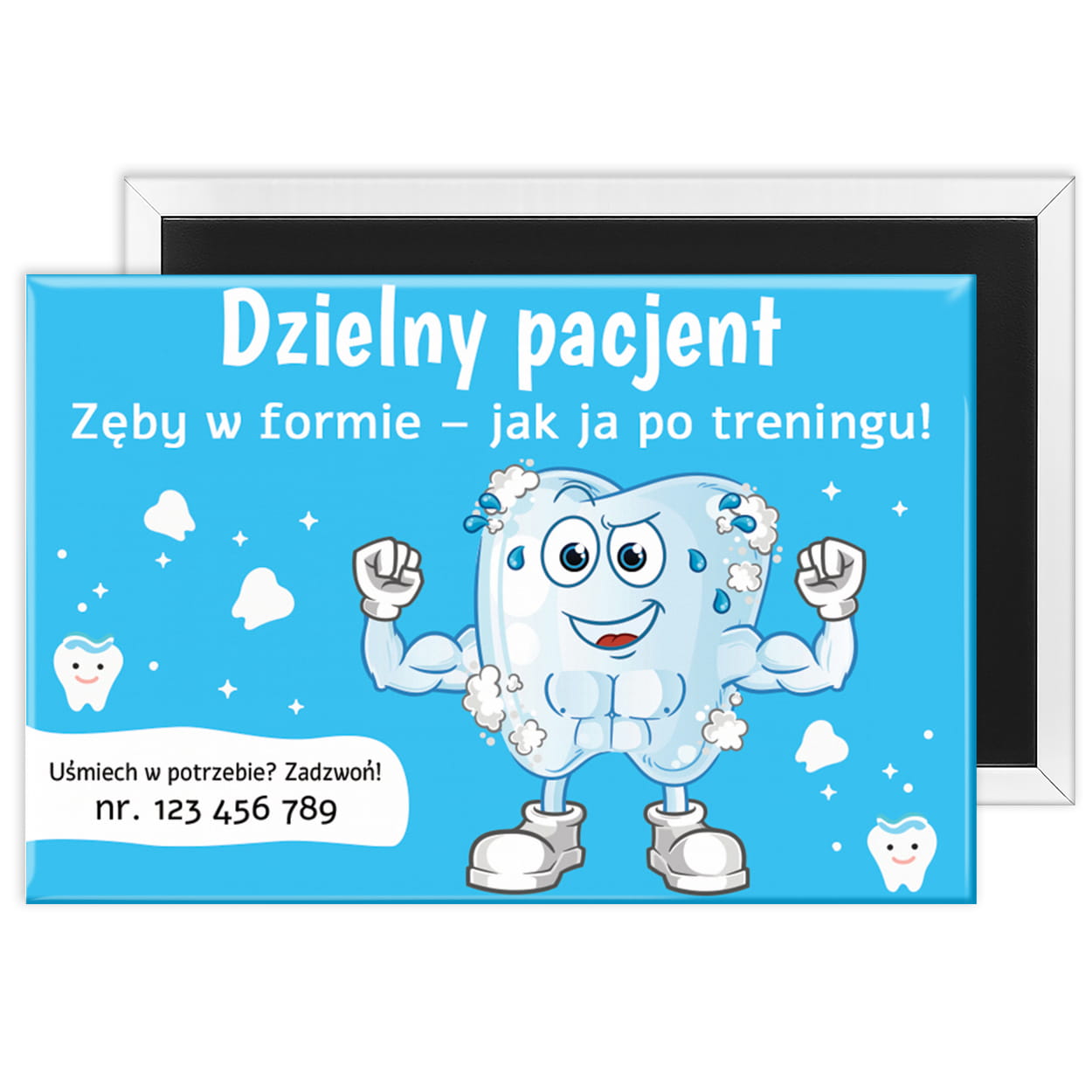 - Kolorowa dekoracja na lodówkę lub tablicę – codziennie wywołuje uśmiech, przypominając o wizycie i jednocześnie utrwala markę gabinetu w domu pacjenta.